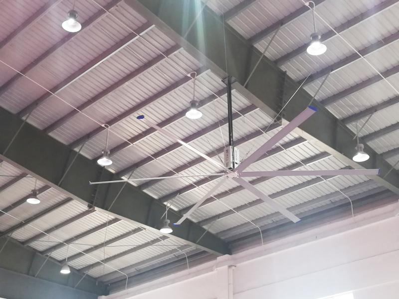 如上圖所示,該圖示是一幢典型的高大型磚混結構工業廠房建筑,生產車間室內有熱源,夏季室溫常常高溫,通風不暢。如若安裝8臺昊柏工業大風扇,便可實現良好的人員降溫、環境通風改善目標。昊柏工業大風扇,是一種直徑達7.3米的巨型吊扇,應用空氣動力學,作6扇葉設計的高效通風降溫科技產品。福泰工業大風扇每小時耗電1度半,空氣流通量13200立方米/分鐘,如果建筑空間結構及高度允許的話,單機可通風覆蓋車間面積800-1600㎡,氣流由上而下成錐形往地面推動,到地面沿水平方向流動,遇到側面阻隔或臨近風扇的水平氣流后向上推動到屋面,對車間環境實現有效的全方位整體通風及人員有效降溫。